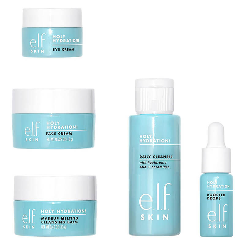• e.l.f. SKIN's Hoy Hydration! products are infused with Hyaluronic acid to help hydrate and plump the skin, Ceramides to help build up the skin's moisture barrier, and Peptides for refreshing complexion.